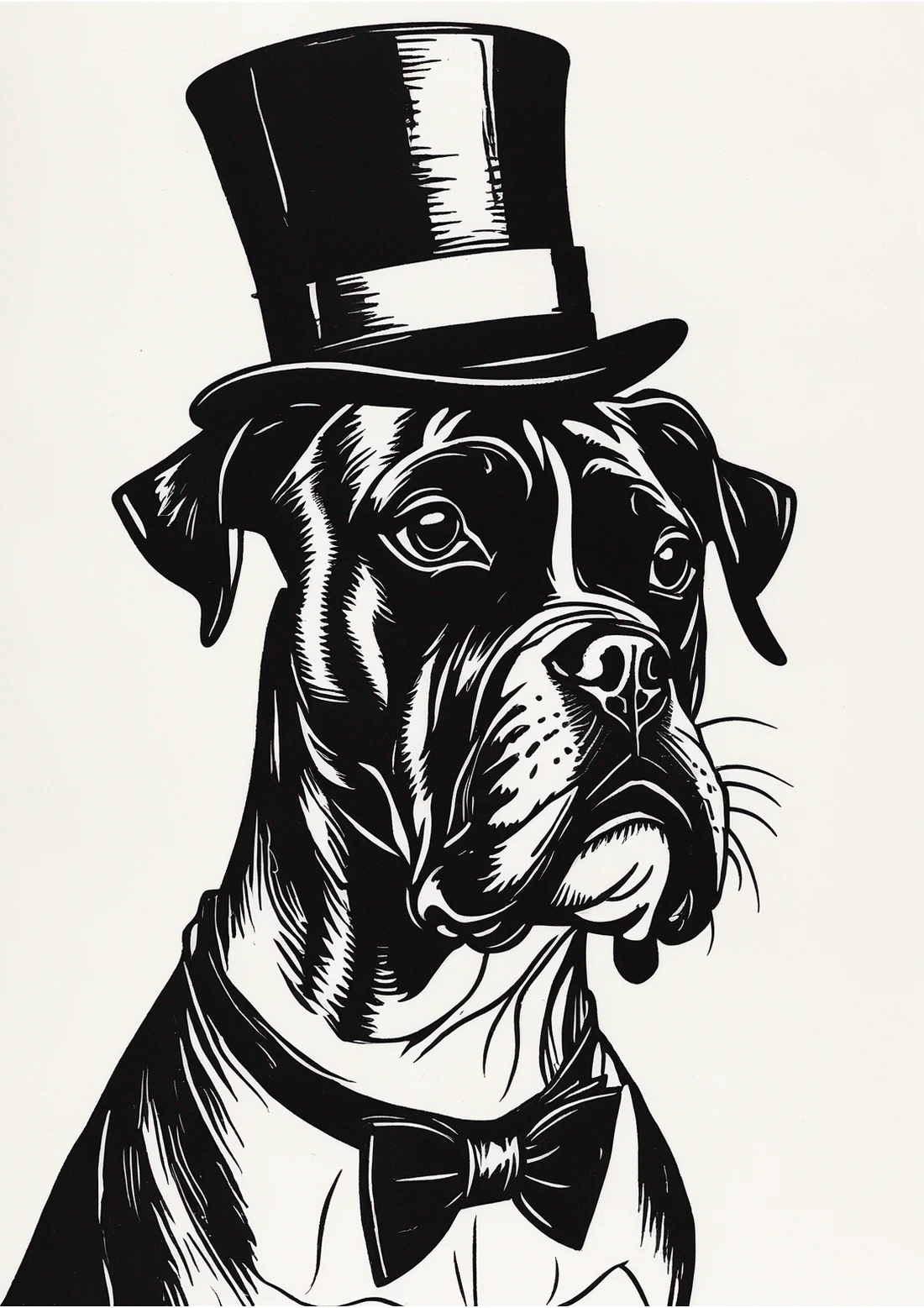 Introducing the stunning “Formal Boxer Dog” print, a captivating illustration that combines elegance with a playful spirit. Featuring a distinguished Boxer adorned in a classic top hat and bow tie, this artwork showcases a striking monochrome palette that enhances its sophisticated appeal. The bold lines and intricate details bring out the dog’s expressive features, creating a piece that demands attention and sparks conversation. Perfect for dog lovers and art enthusiasts alike, this print exudes charm and character, making it an ideal addition to any modern or eclectic interior. The whimsical yet refined style adds a touch of personality to your space, evoking a sense of joy and warmth. Elevate your decor with the “Formal Boxer Dog” print, and let this dapper canine become a focal point in your home.