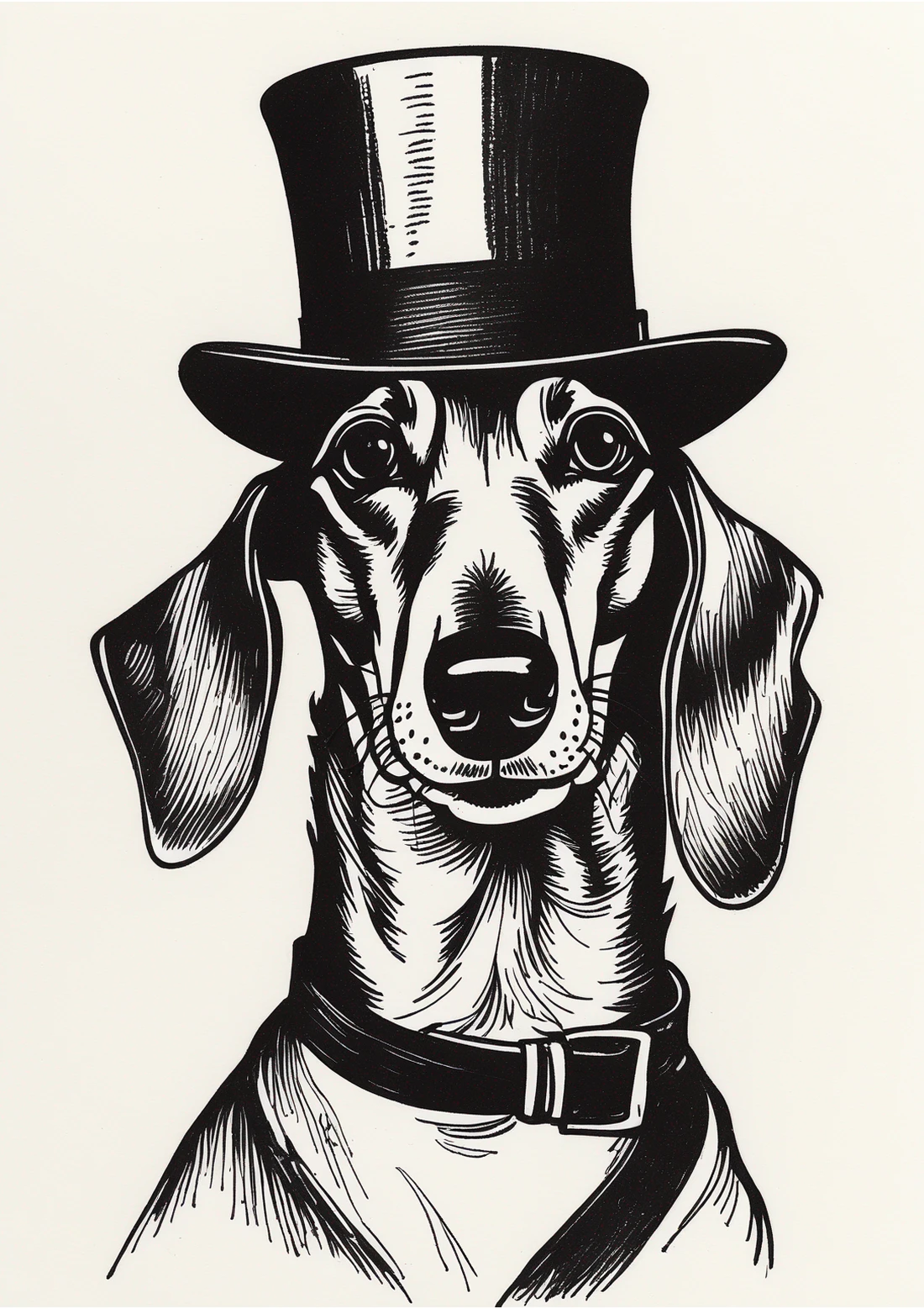 Introducing the ‘Formal Dachshund (Miniature Smooth Haired)’ print, a whimsical yet elegant depiction of this beloved breed. The stark black and white palette creates a striking contrast, drawing attention to the intricate details of the dog’s features and the stylish top hat it wears. This illustration exudes a playful charm, perfect for adding a touch of personality to any room. The sophisticated design captures the essence of the dachshund’s character, blending humour with refinement. Ideal for dog lovers and art enthusiasts alike, this print serves as a conversation starter and a delightful addition to your home decor. Hang it in your living room or study to elevate the space with its unique flair and timeless appeal.