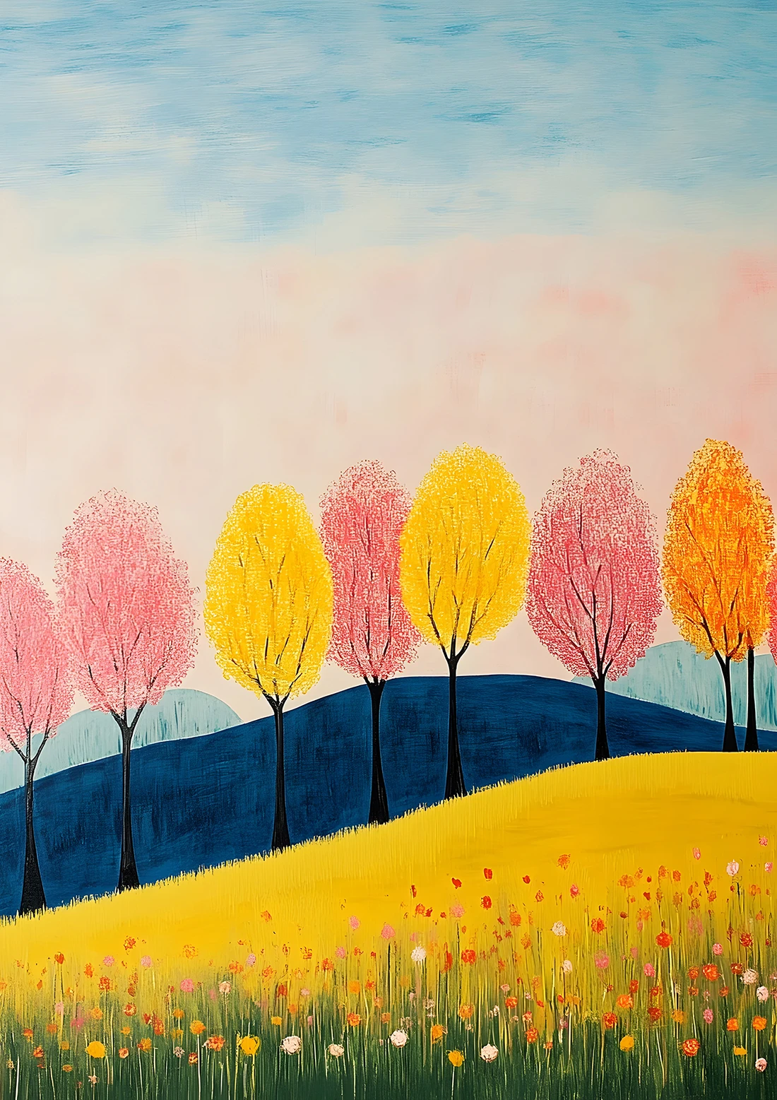 Immerse yourself in the vibrant hues of ‘Autumn Hills’, a captivating print that encapsulates the essence of autumn at dusk. The striking combination of pink and yellow trees stands in stark contrast against deep blue hills, creating a lively yet serene atmosphere. This artwork not only celebrates the beauty of nature but also evokes a sense of nostalgia, inviting viewers to reflect on the seasonal changes that bring warmth and colour to our surroundings. The vivid colour palette enhances the mood of the piece, making it a perfect addition to any space. The gentle brushstrokes and playful composition convey a sense of movement, as if the landscape is alive with the rustling of leaves and the whisper of the wind. This print serves as a reminder of the beauty that nature offers, making it an ideal choice for those who appreciate art that resonates with the changing seasons.