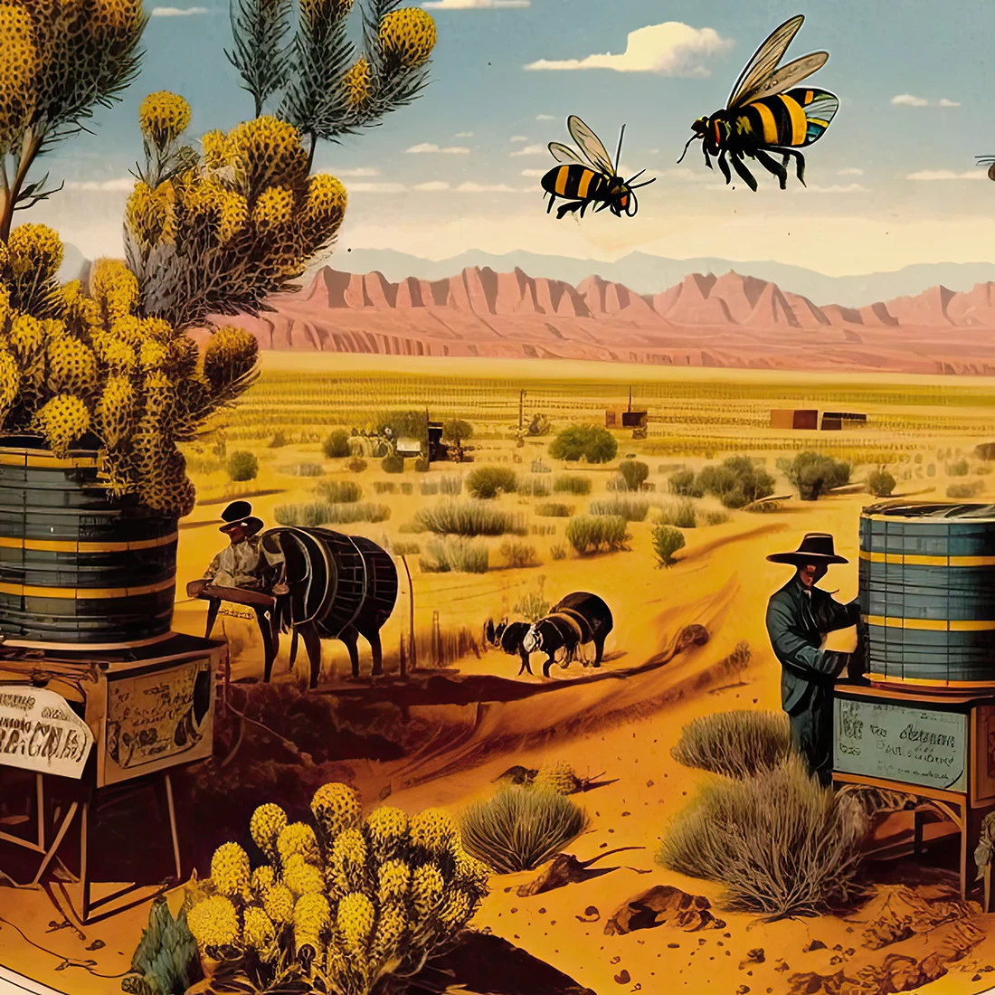 Bees #4 is a captivating print that beautifully captures the vibrant essence of nature and highlights the crucial role bees play in our ecosystem. The warm golden hues evoke a sense of calm, inviting viewers to contemplate the delicate balance of life. This artwork showcases the intricate beauty of these essential pollinators, serving as a poignant reminder of their significance in maintaining ecological harmony and the fragility of our environment. Inspired by mid-20th-century vintage aesthetics, the composition skillfully blends symmetry with simplicity. Lush landscapes and blooming flora draw the eye, celebrating the resilience of nature. Perfect for nature enthusiasts, this stunning print infuses any space with a vivid burst of colour while encouraging reflection on our duty to protect the planet. Embrace the wonders of our ecosystem with this enchanting piece, ideal for creating a serene and inspiring atmosphere in your home.