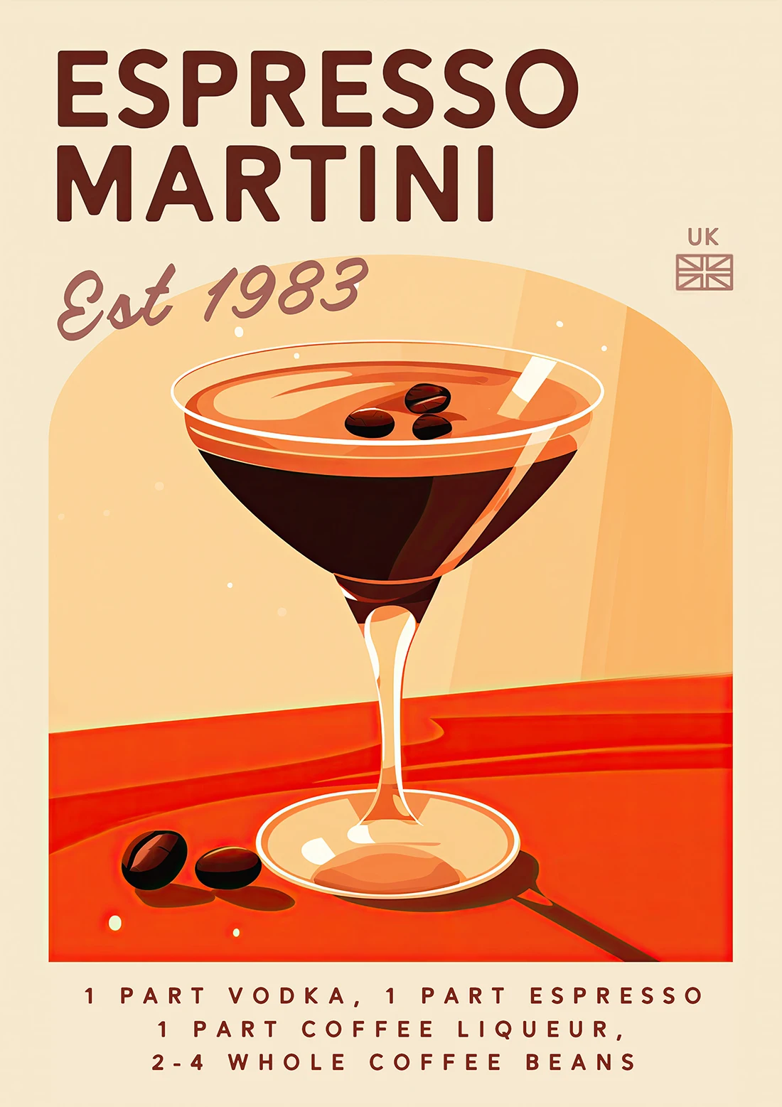 Celebrate the allure of the espresso martini cocktail with this stunning print, a refined homage to style and flavour. The artwork showcases a rich palette of deep browns and vibrant reds, perfectly capturing the lively essence of social gatherings. Since its inception in 1983, this iconic cocktail has captivated enthusiasts around the globe, and this piece beautifully reflects its enduring charm. With a contemporary design and striking colours, this print serves as a bold statement in any setting, be it your kitchen, bar, or dining area. It exudes a dynamic energy that sparks conversation and connection. Perfect for coffee lovers and cocktail aficionados alike, this artwork adds a unique touch that celebrates a beloved classic. Elevate your space with this exquisite depiction, inspiring stylish gatherings filled with flavour and joy.
